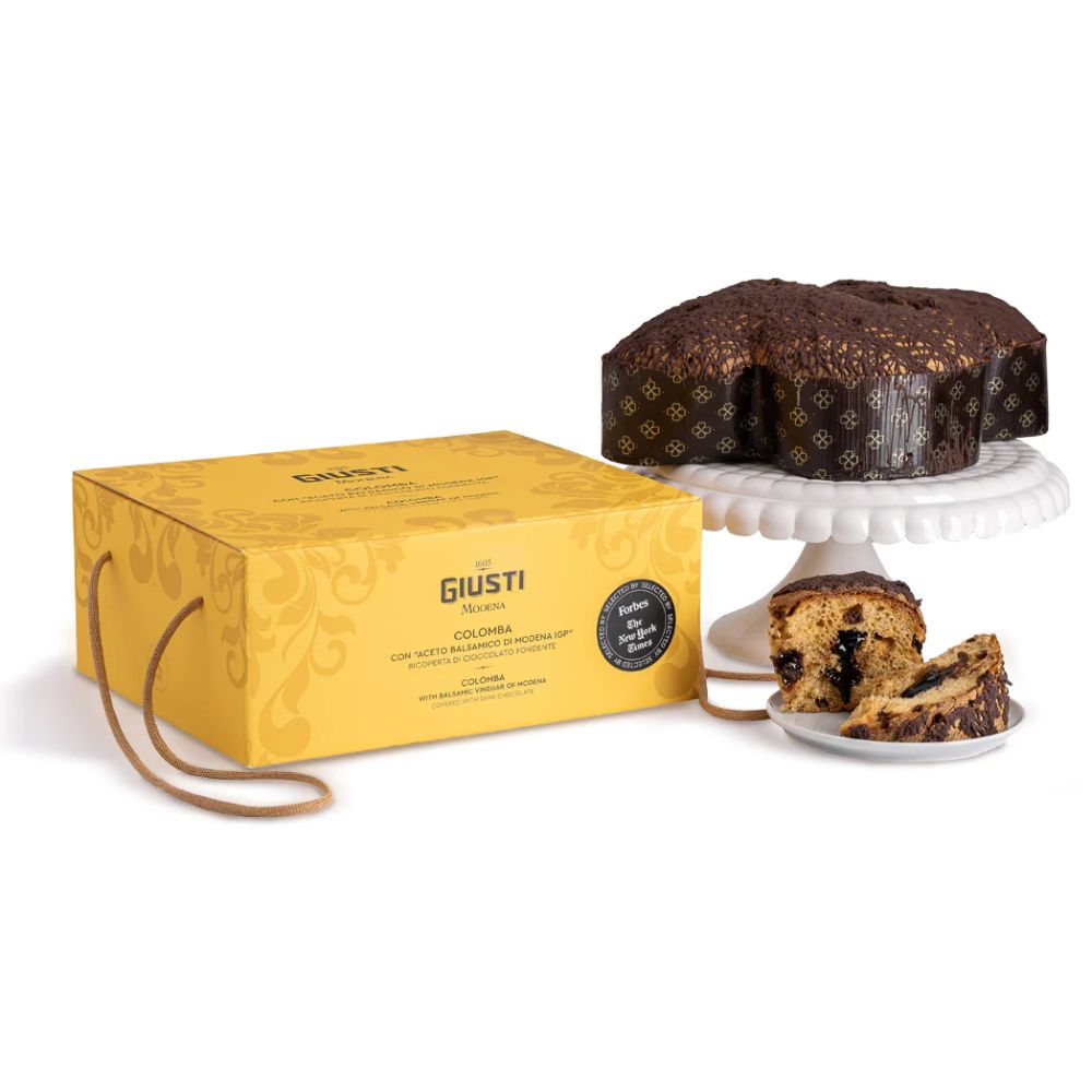 Dall’incontro fra l’agrodolce dell’Aceto Balsamico di Modena IGP e la sofficità del tradizionale dolce pasquale, nasce una Colomba morbida, fragrante e aromatica. Il 3 Medaglie d’oro Giusti viene utilizzato per arricchire l’impasto, per far macerare le uvette, che risultano così più profumate e aromatiche, e aggiunto alla crema di farcitura. La Colomba Giusti è infine ricoperta con una glassa al cioccolato fondente. Un classico dolce pasquale dall’abbinamento insolito e originale.