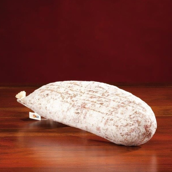 Prodotto di forma cilindrica di carne suina, insaccato con aromi naturali e latte magro in polvere, insaccato in budella di maiale e stagionato per almeno 40 giorni. Impasto di colore rosso rubino con macinato di lardelli bianchi.