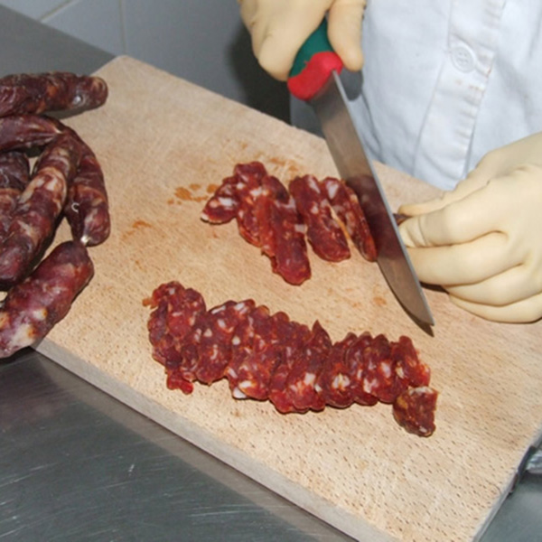 Le carni utilizzate vengono da maiali large white landrace, prevalentemente allevati in aziende locali e alimentati con crusca, mais e fave e ghiande fino a raggiungere circa 180 Kg (necessari per la maturazione della carne). La selezione accurata di tagli porta all’utilizzo di spalla, coscia e sottocoscia per le parti magre e di pancetta e capicollo quelle grasse; il tutto battuto a punta di coltello viene conciato con una ben dosata ricetta di sale, peperoncino, aglio e buccia d’arancia. Il composto è quindi insaccato in budello di maiale ricavando salsicce di circa 100 grammi che vengono legate manualmente. Fresca si consuma cotta alla brace. L’ affumicatura e la stagionatura invece avviene in apposite stanze dotate di camino a legna e può protrarsi per 20 giorni. Le salsicce vengono esposte in sostanza al fumo attenuto da alberi tipici della nostra zona come il carpino bianco, il cerro e la quercia.