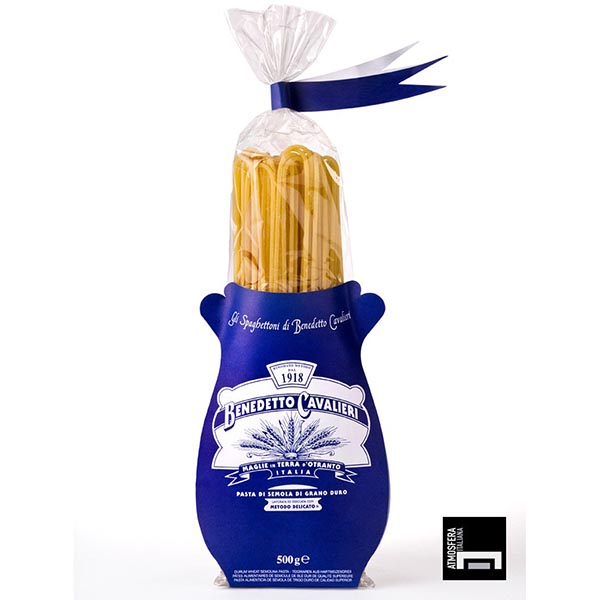 La pasta Benedetto Cavalieri è rinomata nel mondo per: la rigorosa selezione di grani duri italiani che crescono in terreni vocati soprattutto sulle colline di Puglia e Basilicata; il grano è coltivato senza il massiccio e consueto uso di fertilizzanti chimici che aumentano le rese a scapito della qualità; il metodo di lavorazione definito “DELICATO”: prolungata impastatura, lenta gramolatura, pressatura e trafilatura al bronzo ed essiccazione a bassa temperatura. Tutto questo permette di custodire il sapore tipico, assicurare una consistenza assolutamente naturale e una grande permeabilità ai condimenti. Il “Metodo Delicato”, infine, garantisce la completa conservazione dei preziosi valori nutritivi del buon grano duro; la passione, la cura e la continua ricerca della massima qualità, che la Famiglia Cavalieri si tramanda di generazione in generazione.
