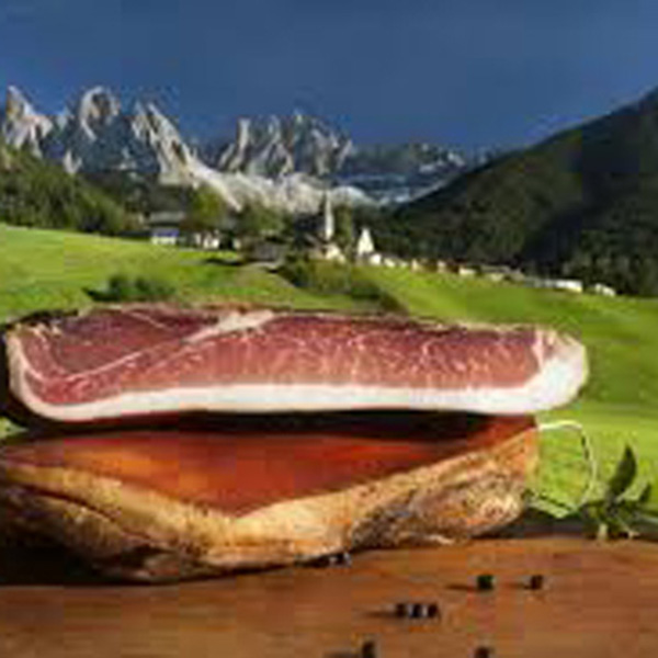 Lo speck Riserva è il vanto della casa, prodotto con pregiate cosce di puro suino nazionale con affumicatura delicata. Ha una giusta marezzatura di grasso che conferisce al prodotto un sapore delicato e dolce; morbido dopo una stagionatura di 10 mesi. Refilato al coltello nella forma a scudo. Il nostro trattamento di affumicatura avviene con l’utilizzo di legno aromatico e successivamente la stagionatura prosegue in cantine di montagna, dove l’aria pura della Val di Fiemme contribuisce a far maturare fragranze e gusti particolarissimi. Diamo molta importanza ad una “concia” (trattamento con aromi naturali e spezie) molto equilibrata, recuperata da un’antica ricetta di famiglia trasmessa negli anni di padre in figlio. Alla base della salatura e dell’aromatizzazione vi sono quindi i segreti di un’antica tradizione: dal sale al pepe, dall’alloro al pimento, dal rosmarino al ginepro… Il risultato è uno speck dalla lunga stagionatura, saporito ma al contempo delicato, sintesi perfetta di sapori e aromi.