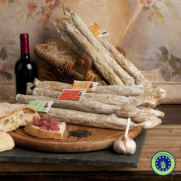 Lo Strolghino nella storia è sempre stato il primo salume che si consumava, data la sua cortissima stagionatura, e che confermava quanto potevano essere buoni i restanti salumi di più lunga maturazione fatti con la carne dello stesso maiale. La tradizione dice che il suo nome derivi dal termine “Strolga” che dal dialetto vuol dire Strega, perché bisogna avere doti particolari per fare un salame così fragrante e delicato. Lo strolghino si caratterizza per una lavorazione artigianale molto accurata: si prende la coscia del maiale, si seziona, si trita e la si lavora tal quale senza aggiungere grasso. In questo modo la percentuale massima di grasso di questo apprezzato salume è del 5%. Non aggiungiamo ne’ nitriti, ne’ nitrati ne’ conservanti altri. Si aggiungono spezie e aromi provenienti da aziende biologiche che certificano inoltre l’assenza di Ogm, di glutine, di derivati del latte e di allergeni. Insaccati in budello naturale, vengono portati ad una stagionatura lenta e senza forzature.