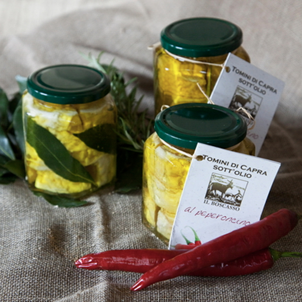 Pasta bianca cremosa naturali o al pepe Stagionatura – 10/15 giorni. Pezzature di circa 80 gr. Forme cilindriche basse di circa 7 cm di diametro beige. Pasta bianca uniforme con proteolisi accentuata nel sottocrosta. Tomini stagionati sott’olio con aromi.
